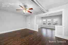 4222 Harrison St #2S, Kansas City, MO is a 2 bedroom, 1 bathroom apartment for rent. It is located in the South Hyde Park neighborhood of Kansas City. It has apartment amenities including on-site laundry, hardwood floor, ceiling fan, air conditioning, assigned parking, in-unit laundry, dishwasher, fireplace, and high ceilings. Cats and dogs are allowed, making it a pet-friendly apartment.