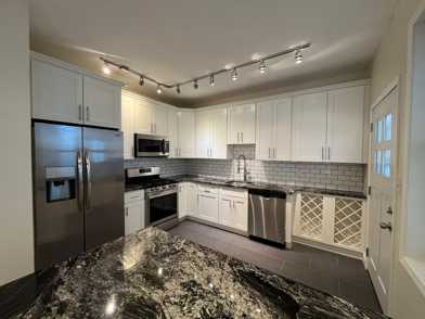 This is a recently renovated 3 bedroom, 1st floor apartment with all new wiring and plumbing. A high efficiency central air and heating system was installed along with new windows. This unit has hardwood floors and ceiling fans in each bedroom as well as the living room. The kitchen features granite countertops, white cabinets, and stainless appliances including a refrigerator with water & ice in the door, gas oven/range, built in microwave, and dishwasher. The ceramic tiled bathroom has a large soaker tub and double vanities. Exposed brick adds lots of charm. The washer and dryer are in the apartment. This apartment has access to the basement for storage and one off street parking space is included. Landlord pays water and trash. Tenant pays gas and electric.
