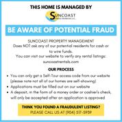 BEAWARE of potential fraud. If you suspect one of our properties being listed fraudulently, please email: **** Suncoast Property Management does NOT ask any of our