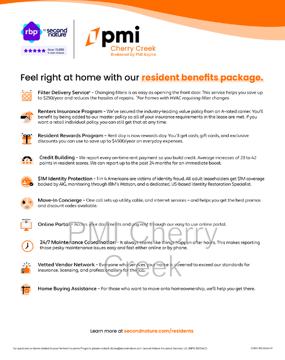 At PMI Cherry Creek, we strive to provide an experience that is cost-effective and convenient. That’s why we provide a Resident Benefits Package (RBP) to address common headaches for our residents. Our program handles insurance, air filter changes, utility set up, credit building, and more at a rate of $39.95*/month, added to every property as a required program. More details upon application.